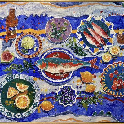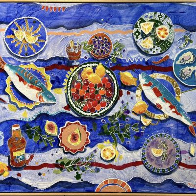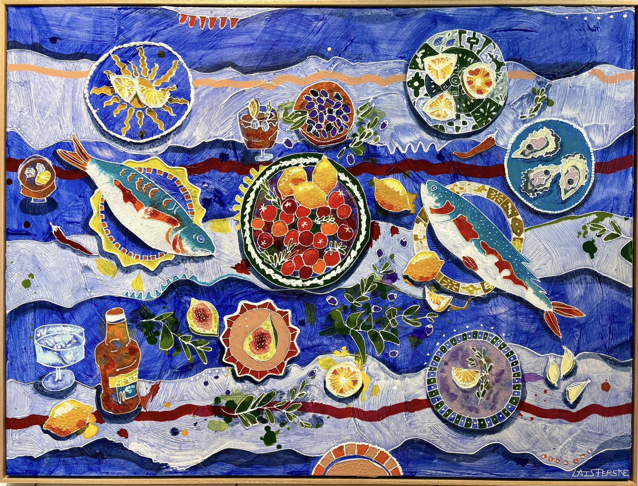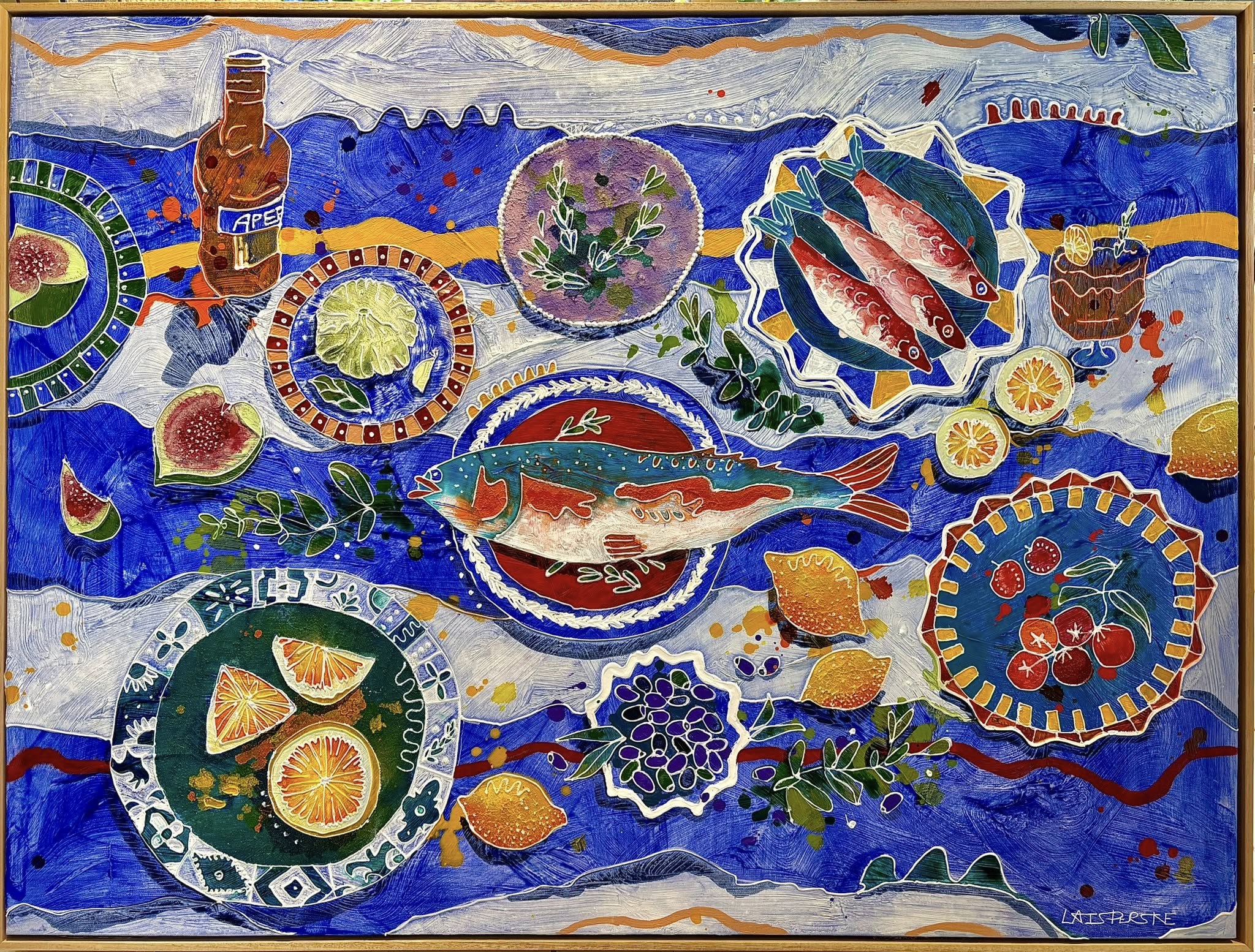 La Tavola Mediterranea by Lais Perske. Mixed media on canvas, framed in oak 1250×940