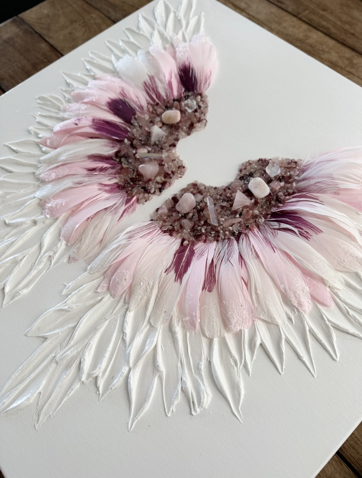 DIVINE LOVE by Tamara Huntington. Handcrafted crystal and feather angel wings on canvas. 50×50. (Rose Quartz,Apophyllite,Garnet,Angel Aura)