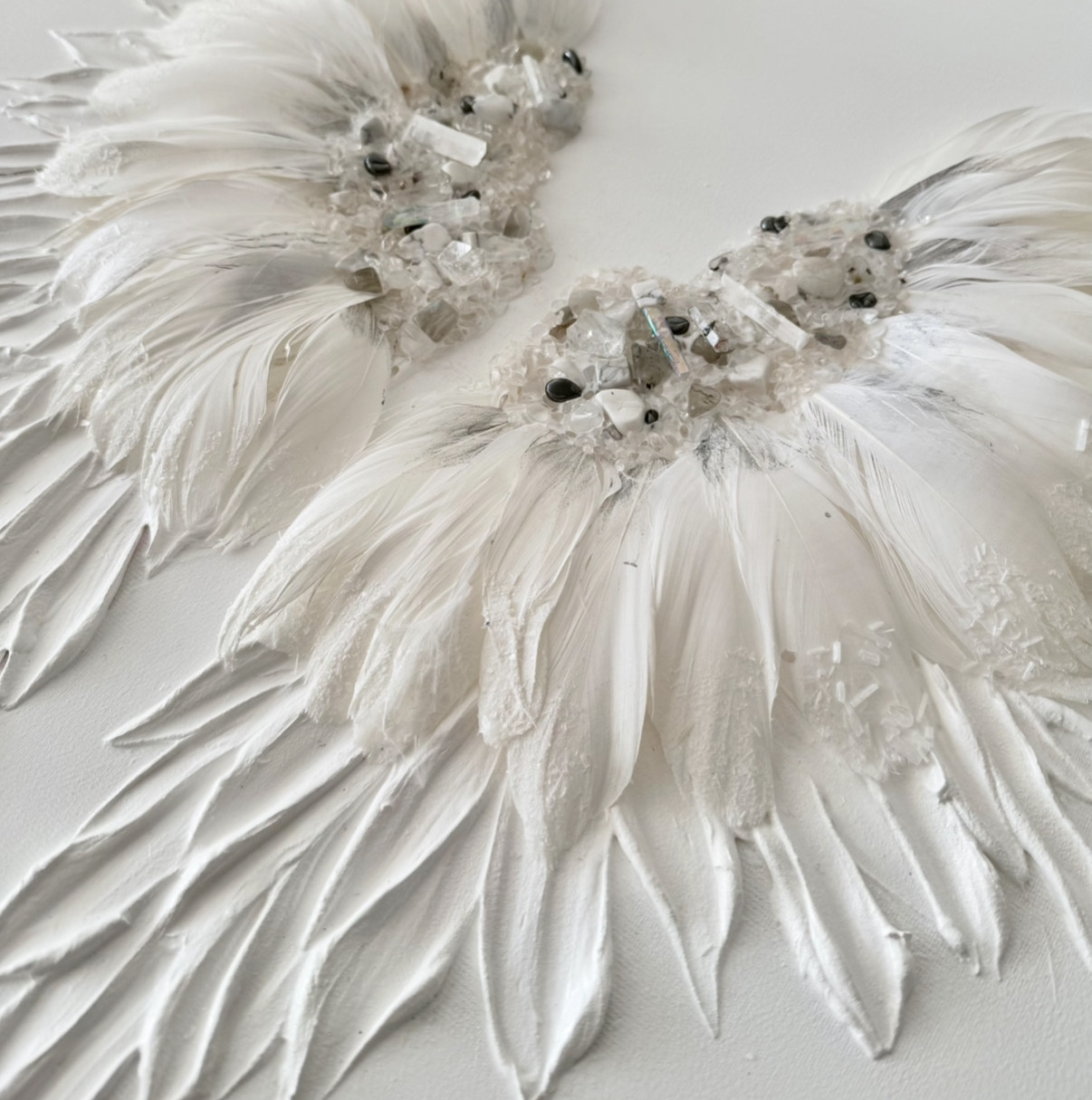 SACRED by Tamara Huntington. Handcrafted crystal and feather angel wings on canvas. 50×50